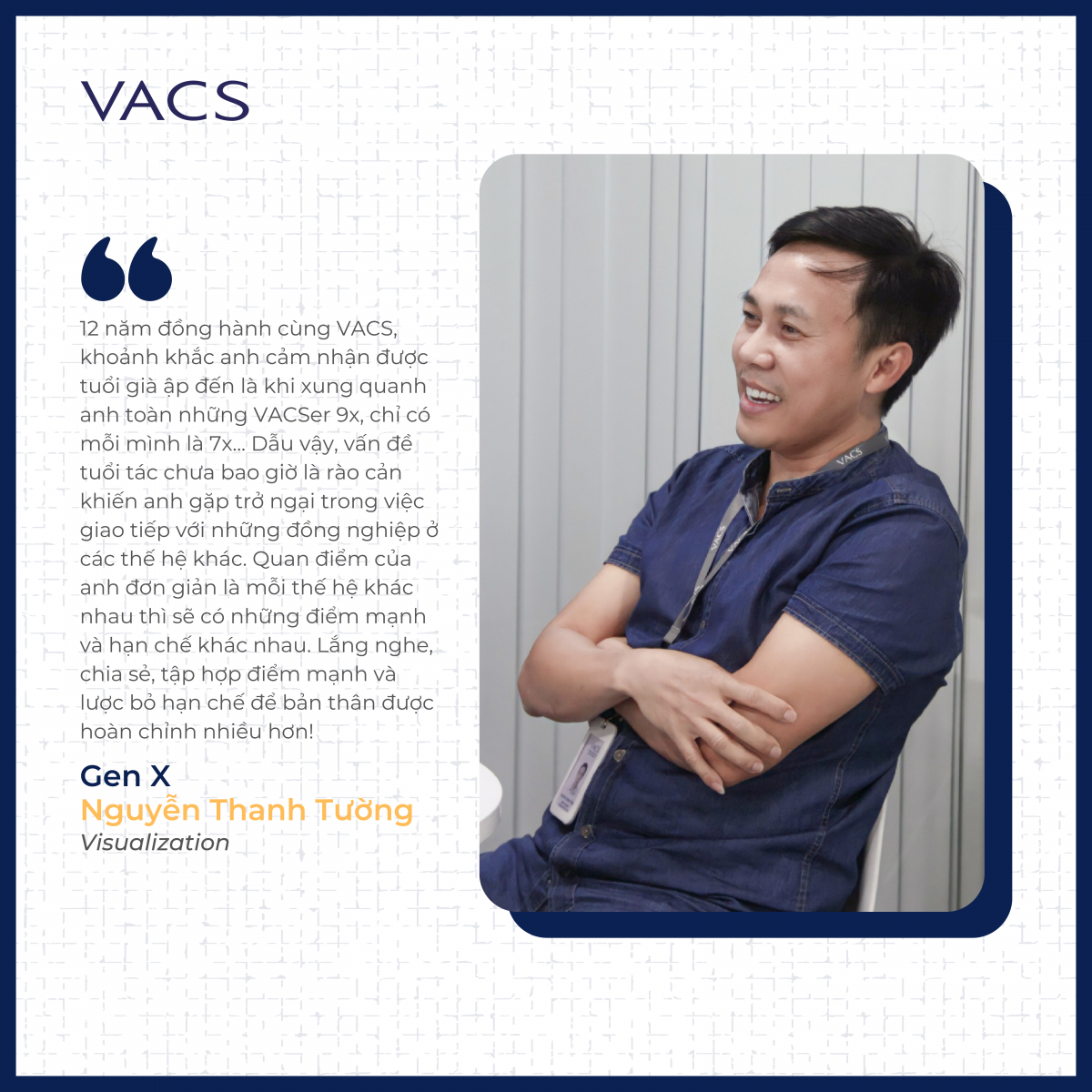 Anh Tường chia sẻ: “12 năm đồng hành cùng VACS, khoảnh khắc anh cảm nhận được tuổi già ập đến là khi xung quanh anh toàn những VACSer 9x, chỉ có mỗi mình là 7x... Dẫu vậy, vấn đề tuổi tác chưa bao giờ là rào cản khiến anh gặp trở ngại trong việc giao tiếp với những đồng nghiệp ở các thế hệ khác. Quan điểm của anh đơn giản là mỗi thế hệ khác nhau thì sẽ có những điểm mạnh và hạn chế khác nhau. Lắng nghe, chia sẻ, tập hợp điểm mạnh và lược bỏ hạn chế để bản thân được hoàn chỉnh nhiều hơn!”