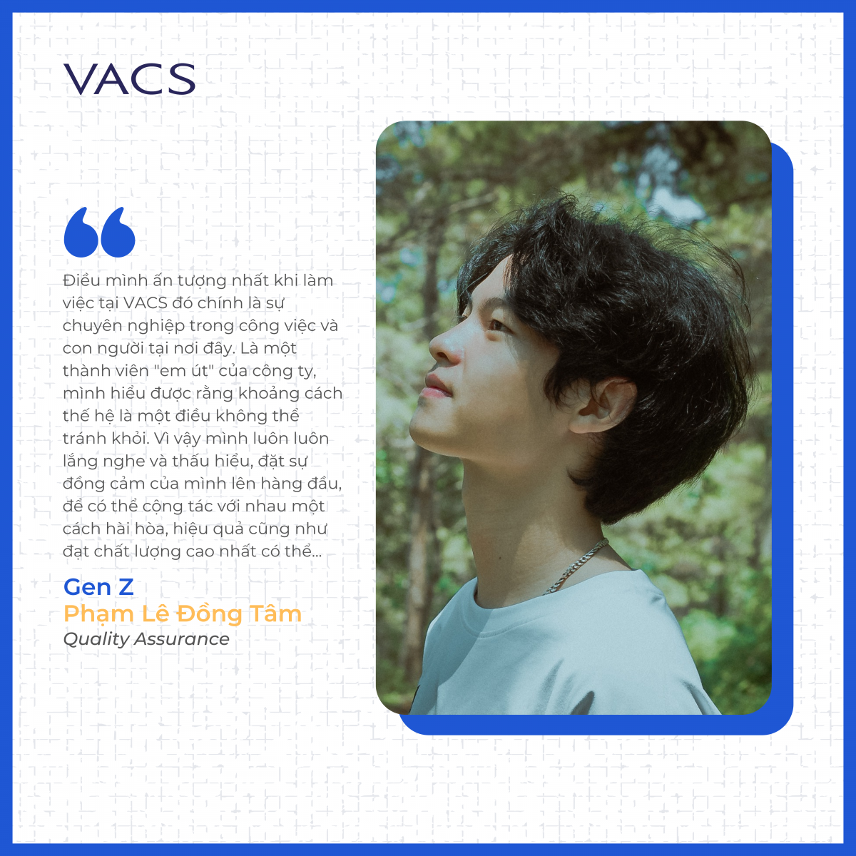 Trong quá trình làm việc, môi trường tại VACS luôn tôn trọng và khuyến khích các cá nhân được tự do bày tỏ quan điểm, thể hiện cá tính riêng góp phần tạo nên một môi trường làm việc năng động. Hãy cùng điểm qua những chia sẻ của 3 VACSer dưới đây để hiểu thêm cách họ nhìn nhận, bày tỏ về thế hệ của mình cũng như cách họ dung hòa được tiếng nói giữa nhiều thế hệ khác nhau nhé!