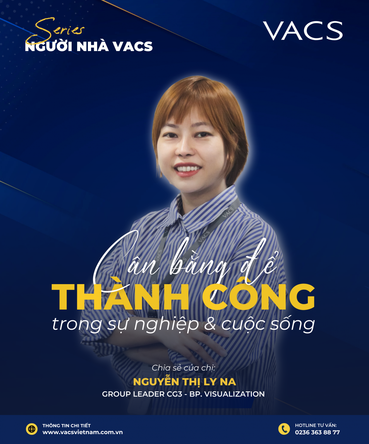 Chào các bạn, trong chuỗi bài viết Series Người nhà VACS hôm nay, chúng ta sẽ có cơ hội gặp gỡ và được lăng nghe những chia của chị Nguyễn Thị Ly Na - Group Leader CG3 của bộ phận Visualization, một nhân vật đã có rất nhiều thành tích nổi bật cùng với đội nhóm của mình trong quá trình làm việc tại VACS.