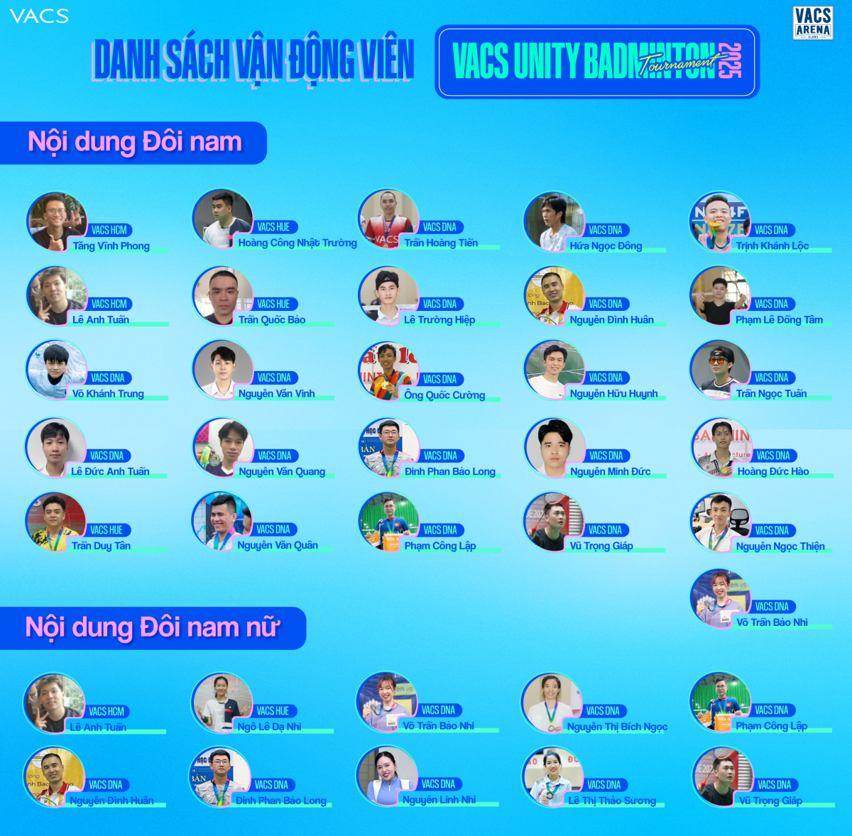 Từ những pha cầu uy lực đến cú bỏ nhỏ tinh tế, hay thậm chí là những trận cười rộn ràng - 30 vận động viên hứa hẹn sẽ tạo nên loạt trận đấu nảy lửa tại VACS UNITY BADMINTON TOURNAMENT 2025.